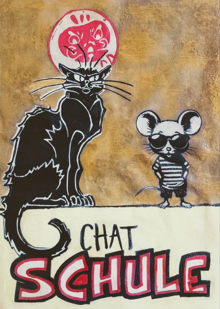 Creating Art is what i do and like about myself. This is the famous french Cat by Rudolph Salis originally called Chat Noir. I’ve created a street art version with a Banksy kind of vibe, called cat school but in slang. It’s not quite finished yet and still under construction and soaking wet so needs time to flatten out before i put the finishing touches on the details.