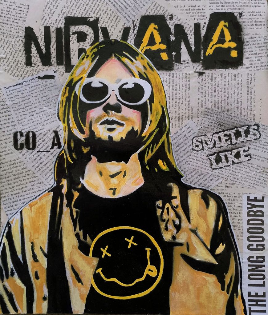 Created with Spray paint acrylic, tube paint, brush, old news and varnish Size 40x30cm.