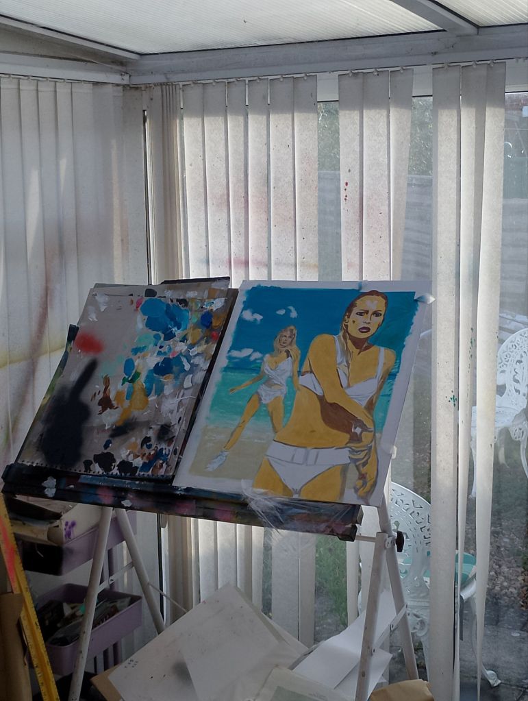 Sneak peak of my new project The bond girl and the 1 million BC girl Early stages of my new project poster end of day 1. I decided to put both iconic women in the same artwork. I’m a bit out of my depth with this one and finding it a challenge. Acrylic on canvas size 24×20 inch. Share this: Share on X (Opens in new window) X Share on Facebook (Opens in new window) Facebook Like Loading... Related