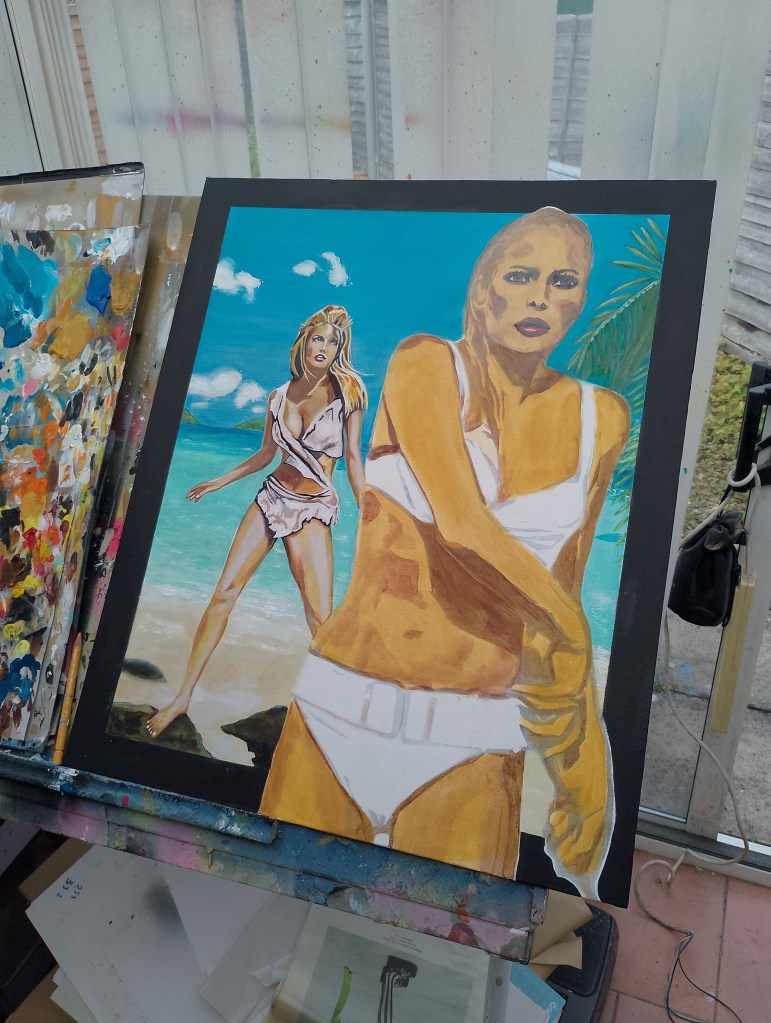 I enjoy painting so much I don’t actually get much time to travel anywhere. This painting is Raquel Welch and Ursula Andreas as Sirens in a new poster I’m currently painting. Got so much to do on this. 3 days in so far and the idea is for Ursula to be walking through the frame.