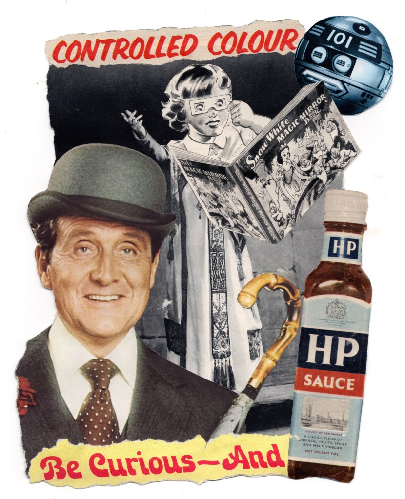 I created this collage inspired by the original Avengers. A surreal advertisement for sauce with vintage old magazine parts with contrasting colours.