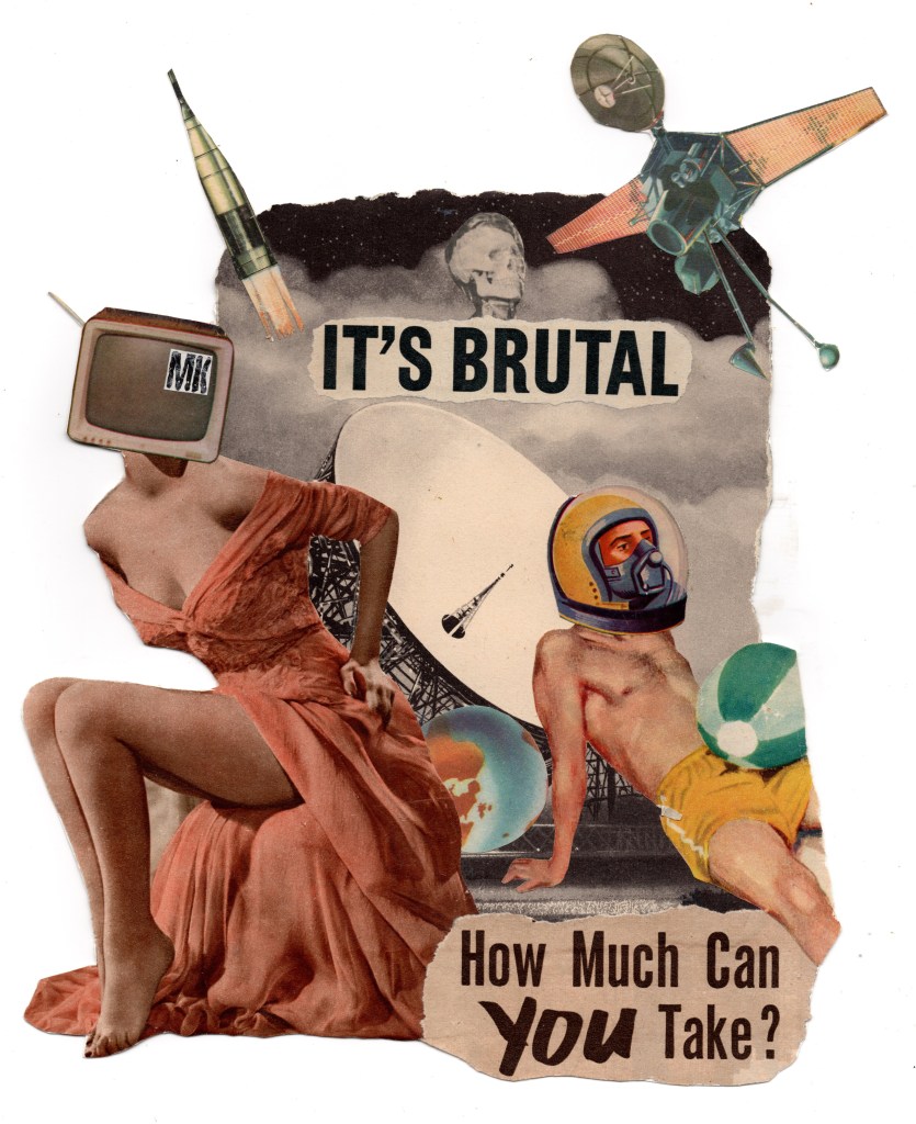 Inspiration for this came from a piece I saw online made by Chris Ashworth. I found some scrap cardboard from a parcel which I had originally used to check the flow of my Airbrush with them simply added the bits you see here from old magazines. The barcode and a piece of tape is the old school way Chris Ashworth did some of his works and those elements inspired me to add those things into this piece.